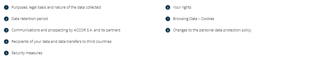 The protection of the personal data of the Users of our Platform is a major concern of Accor. Thus, Accor invites Users to familiarize themselves with the current personal data protection policy which is designed to explain, as transparently as possible, the conditions under which the personal data of Users are processed as part of their use of the Platform.