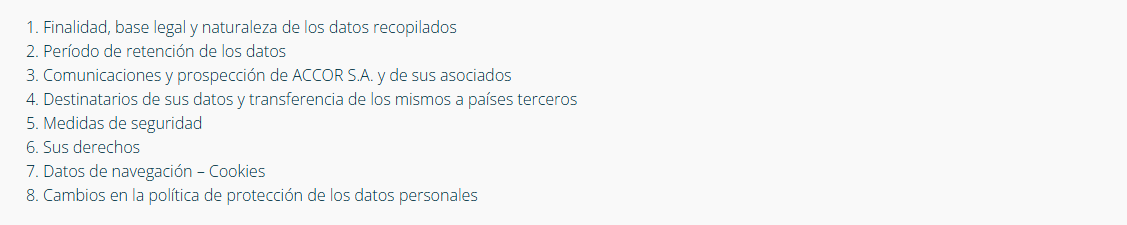 Por último, sus datos podrán ser enviados a las fuerzas policiales y a las autoridades judiciales y gubernamentales, de conformidad con la ley, para la detección y persecución de delitos así como para evitar peligros para la seguridad pública o para permitir a ACCOR S.A. confirmar, ejercer o defender algún derecho legal.