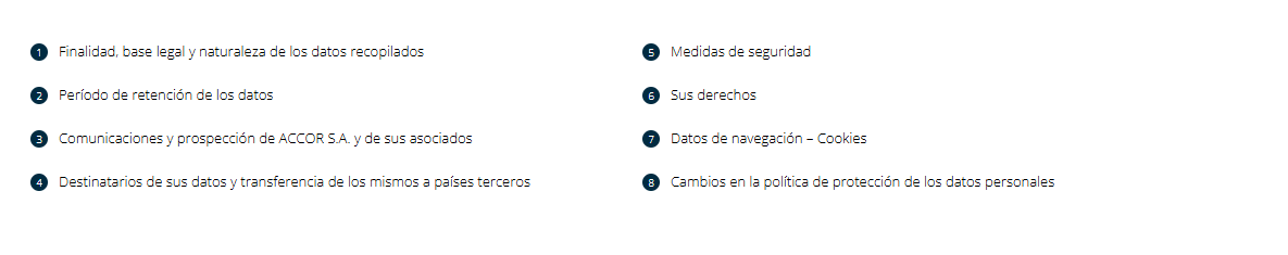 La protección de los datos personales de los Usuarios de nuestra Plataforma es una de las principales preocupaciones de AccorHotels. Por este motivo, AccorHotels invita a los Usuarios a familiarizarse con la política actual de protección de datos de carácter personal cuyo objetivo es explicar, de la forma más transparente posible, las condiciones en las que se procesan los datos personales de los Usuarios en función del uso que hagan de la Plataforma.