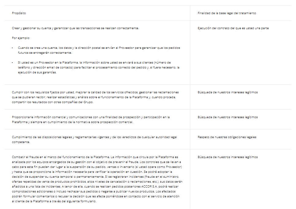 Cuando usted crea una cuenta, busca un proveedor o simplemente navega por nuestra Plataforma, ACCOR S.A., el responsable del tratamiento de los datos y cuya sede social se encuentra en 82 rue Henri Farman, 92130 Issy Les Moulineaux, Francia, recoge datos sobre usted. Estos datos son su título, nombre, apellidos, nombre de usuario, cualificación o cargo, dirección postal y de correo electrónico, número de teléfono del trabajo, contraseña, datos oficiales de su empresa (p.ej., nº SIRET en Francia, número de IVA intracomunitario, etc.), información sobre los pedidos, las conexiones y la navegación en la Plataforma, así como las comunicaciones entre los Usuarios.