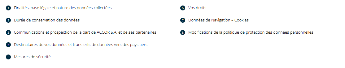 Enfin, vos données pourront être transmises aux forces de police et aux autorités judiciaires et administratives, conformément à la loi, pour la détection et la poursuite d’infractions, la prévention et la sauvegarde de menaces à la sûreté publique, pour permettre à ACCOR S.A. de vérifier, exercer ou défendre un droit en justice.