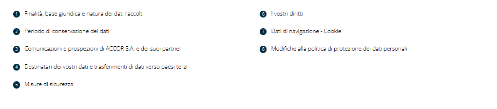 Infine, i suoi dati potranno essere inviati alle forze di polizia e alle autorità legali e governative, in conformità con la legge, per l'individuazione e il perseguimento di reati, per la prevenzione di minacce alla sicurezza pubblica o per consentire ad ACCOR S.A. di confermare, esercitare o difendere un diritto legale.